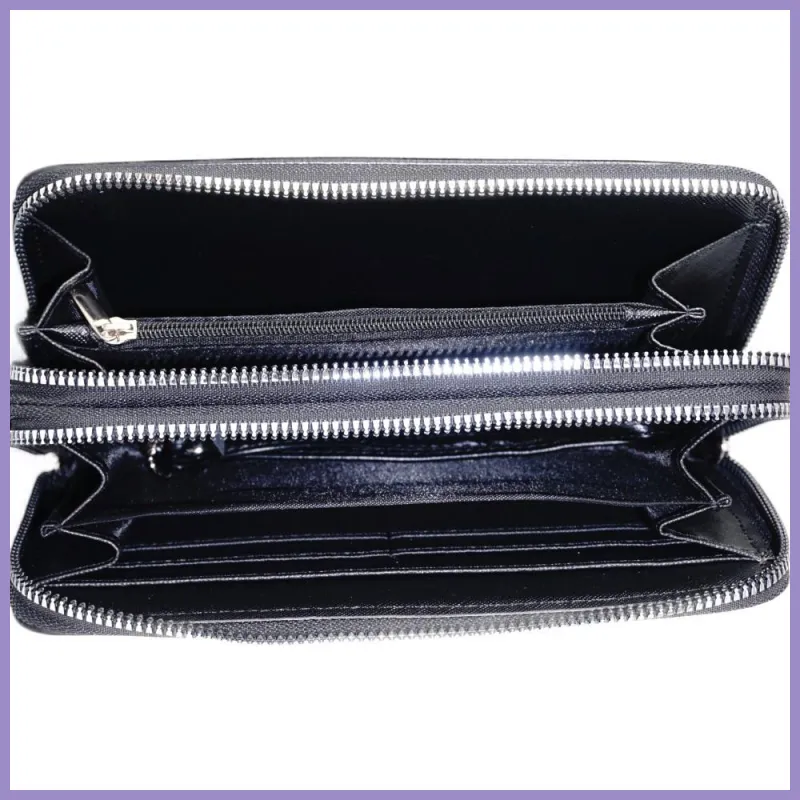 Duplarekeszes női pénztárca felirattal, műbőr. Egyik cipzáras részben 2 széles rekesz és egy cipzáras zseb. Másik cipzáras részében 2 széles rekesz, 2 széles benyúlós zseb és 8 bankkártyatartó. Tartozéka egy kézipánt.