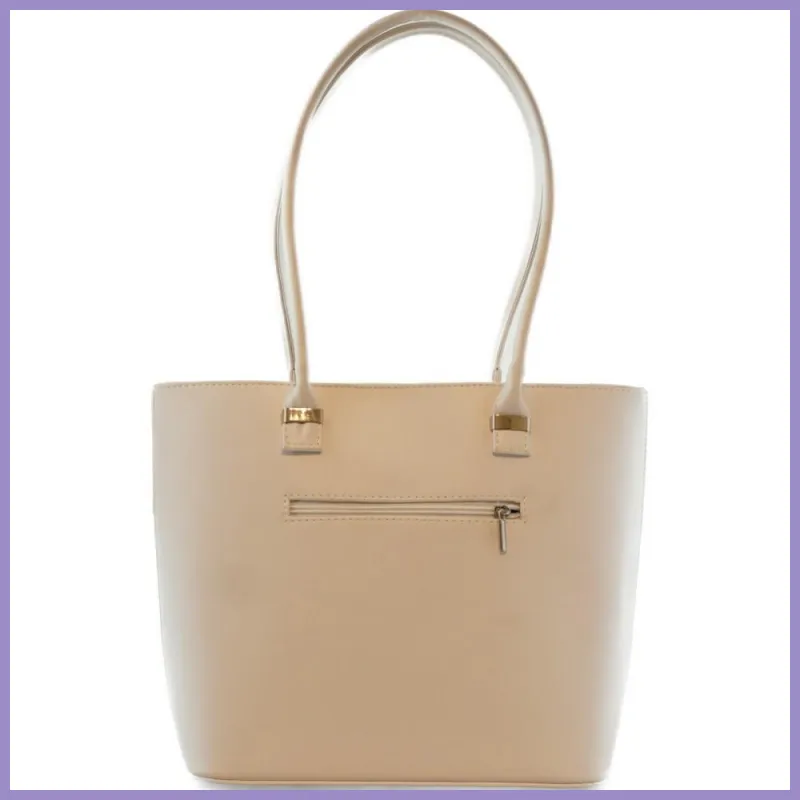 Elegáns női válltáska, elején sávokra osztott, rostbőrből. Hátulján cipzáras zseb található. Belül osztott, egy benyúlós és két cipzáras zsebe van. Méretei: 36×27×13 cm.