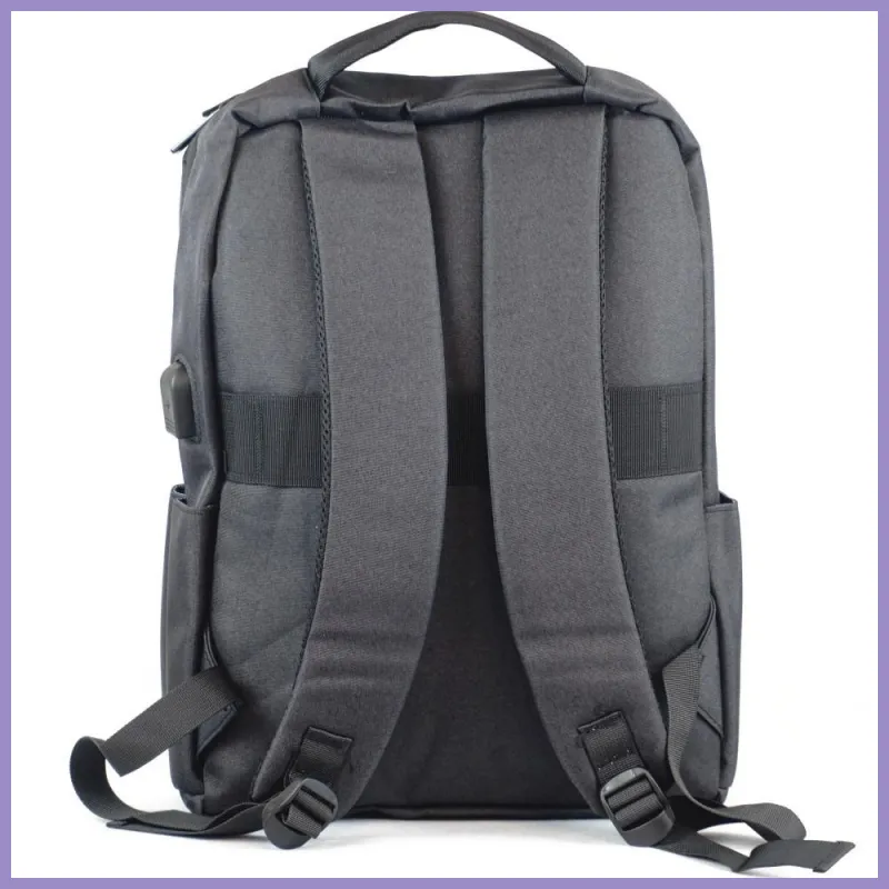 Laptop hátitáska, poliészter, fekete színben. Anyaga erős, jó tapintású poliészter anyag. Fazonja merevített, a laptop védelme érdekében vastag, belül puha. Elején tépőzáras és cipzáras nagy zsebek, oldalain 1-1 benyúlós zsebecske. Belül egy tépőzárral rögzíthető laptoptartó rekesz, valamint egy nagy rekesz két benyúlós zsebecskével. Beépített USB hosszabbítóval, bent az apa, kívül az anya csatlakozóval. Méretei: 30×40×11 cm.