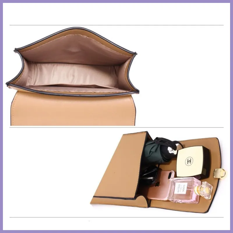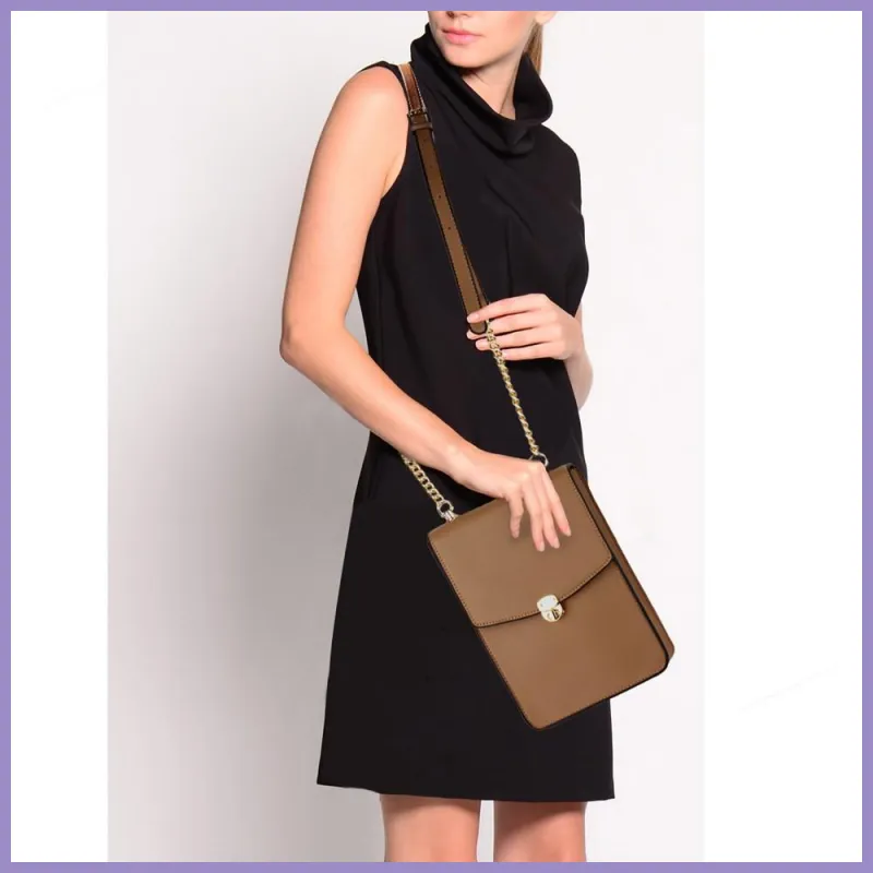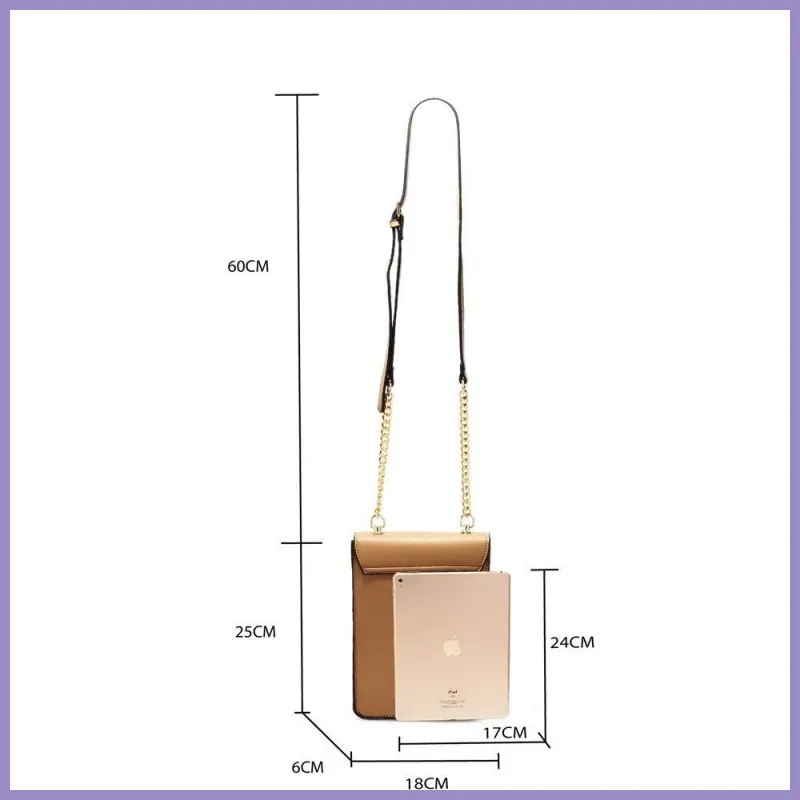 Kisméretű keresztpántos táska műbőrből. Eleje áthajtós, fém csattal záródik. Belseje egyterű, benne egy kisebb benyúlós zsebbel. Vállpántja műbőr és fém lánc kombinációja, hossza 60 cm, állítható. A táska mérete 25 x 18 x 6 cm, súlya 0,540 kg.