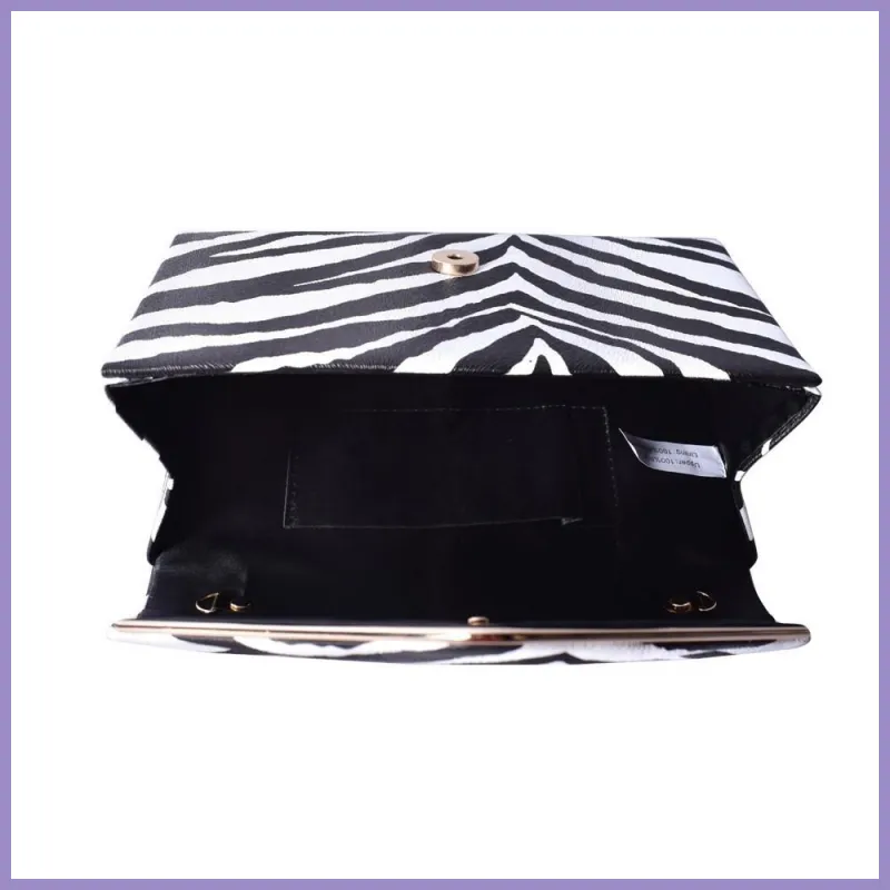 Műbőr partitáska állatszőrmét utánzó mintával. Belseje egyterű egy kis zsebbel, láncon hordozható, mágnespatenttal záródik. Mérete 13,5 x 23 x 5 cm.