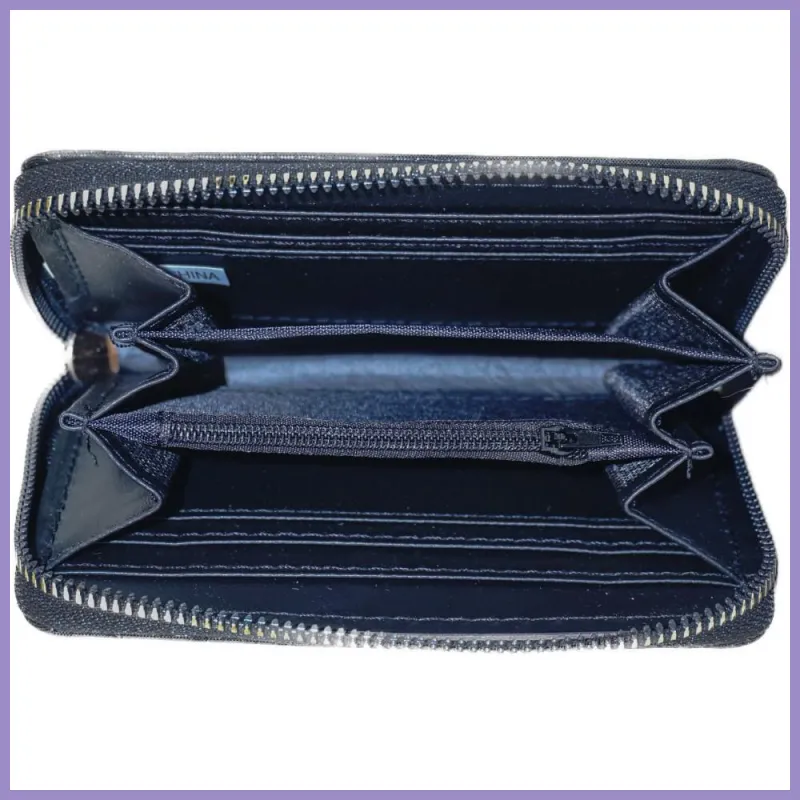 Női pénztárca kígyóbőr mintával, műbőr, zöld színben. Belül 3 nagyobb rekesz, 1 cipzáras aprótartó, 6 bankkártyatartó. Méretei: 14×9×3 cm.