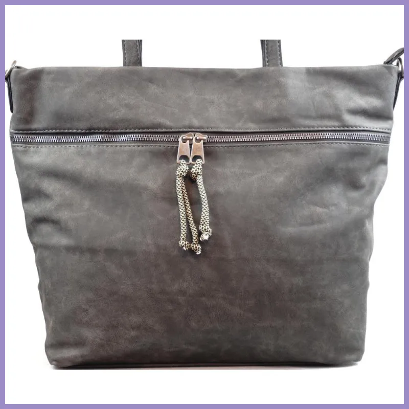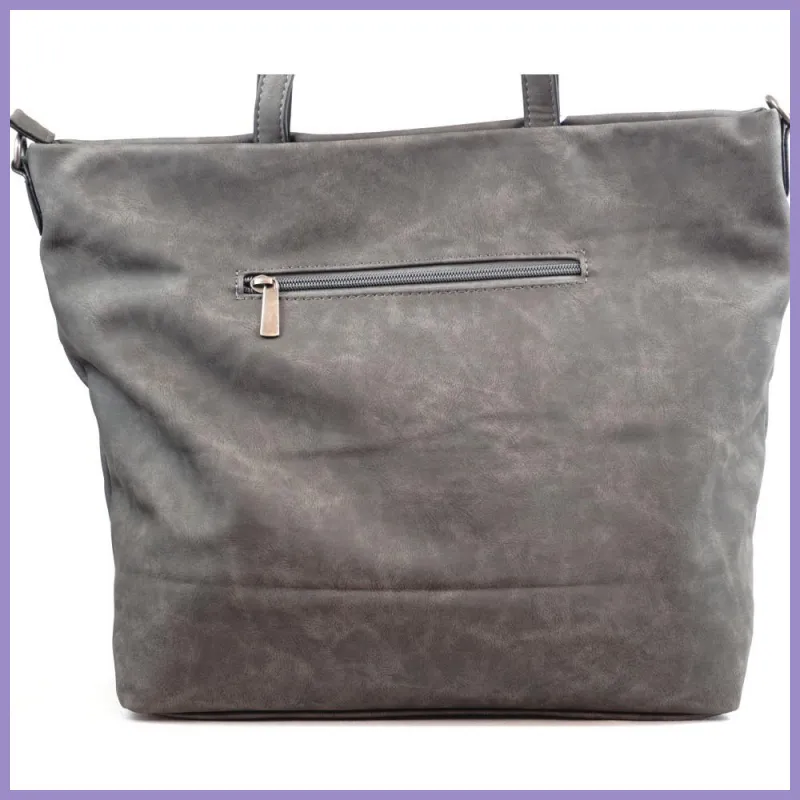 Női shopper válltáska elöl széles zsebbel, műbőr, szürke színben. Anyaga kellemes tapintásúműbőr műbőr. Hátul egy cipzáras zsebe van, a tetején szintén cipzárral nyílik. Belül osztott, 2 cipzáras és 2 benyúlós zseb. Tartozéka egy hosszú vállpánt. Méretei: 41×32×12 cm.
