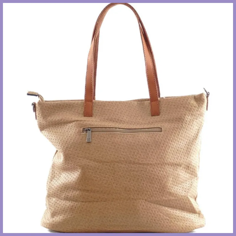 Női shopper válltáska szőttes mintával, műbőr, bézs színben. Anyaga puha műbőr, selymes tapintású, enyhén vastag. Elején 1, hátulján 2 cipzáras zseb. Belül osztott, 2 cipzáras és 2 benyúlós zseb. Tartozéka egy hosszú vállpánt. Méretei: 39×32×12 cm.