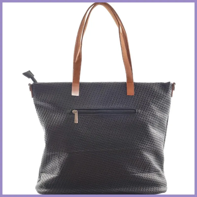 Női shopper válltáska szőttes mintával, műbőr, fekete színben. Anyaga puha műbőr, selymes tapintású, enyhén vastag. Elején 1, hátulján 2 cipzáras zseb. Belül osztott, 2 cipzáras és 2 benyúlós zseb. Tartozéka egy hosszú vállpánt. Méretei: 39×32×12 cm.