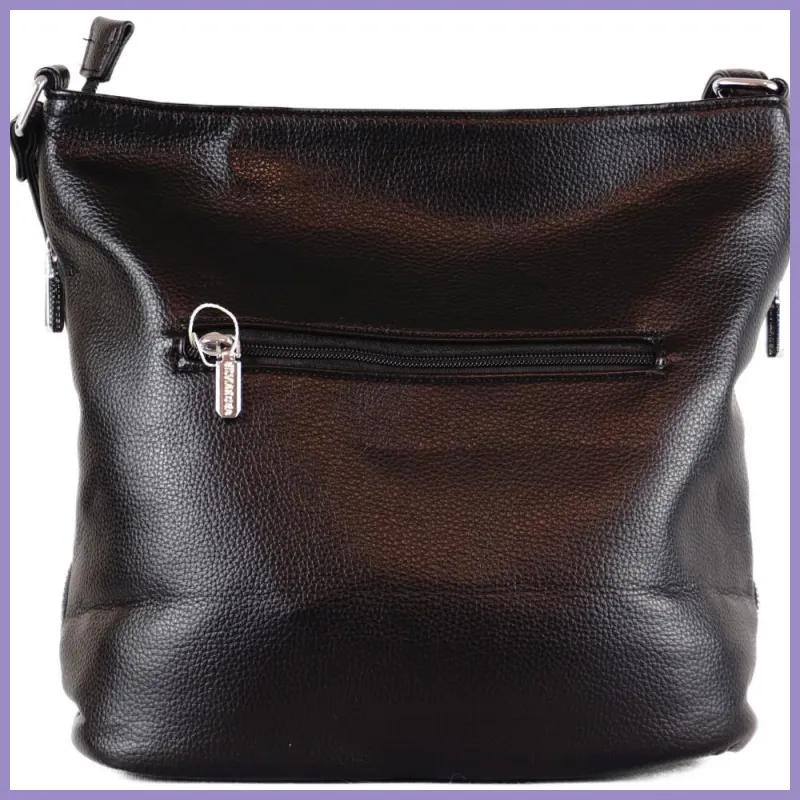 Silvia Rosa női válltáska hímzett pillangós mintával, műbőr. Oldalain és hátulján cipzáras zsebek. Belül osztott, két cipzáras és két benyúlós zseb. Méretei: 32×25×11 cm.