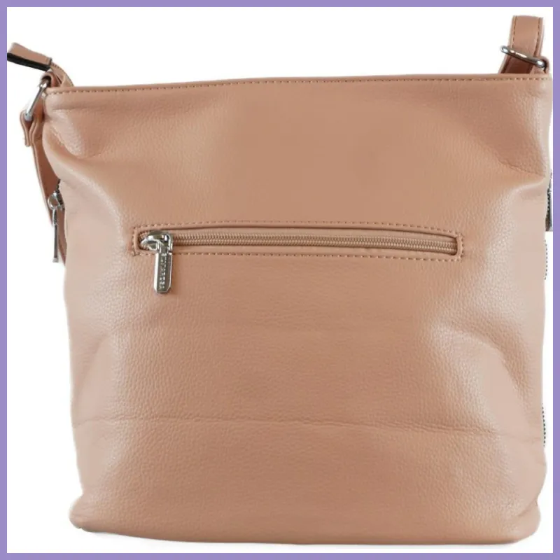 Silvia Rosa női válltáska hímzett virágmintával műbőrből. Oldalain és hátulján cipzáras zsebek. Belül osztott, két cipzáras és két benyúlós zseb. Méretei: 25×27×12 cm.