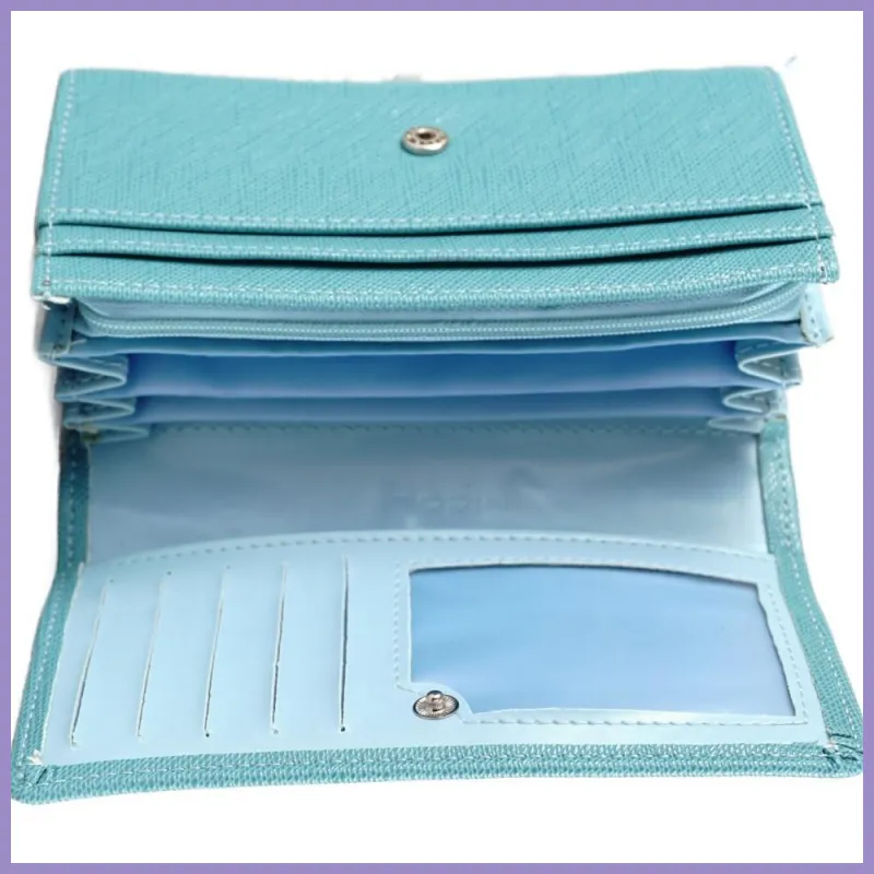 Sok rekeszes egyszerű női pénztárca, műbőr. Belül 6 széles rekesz, 1 cipzáras aprótartó és 5 bankkártyatartó. Méretei: 15×9×3 cm.