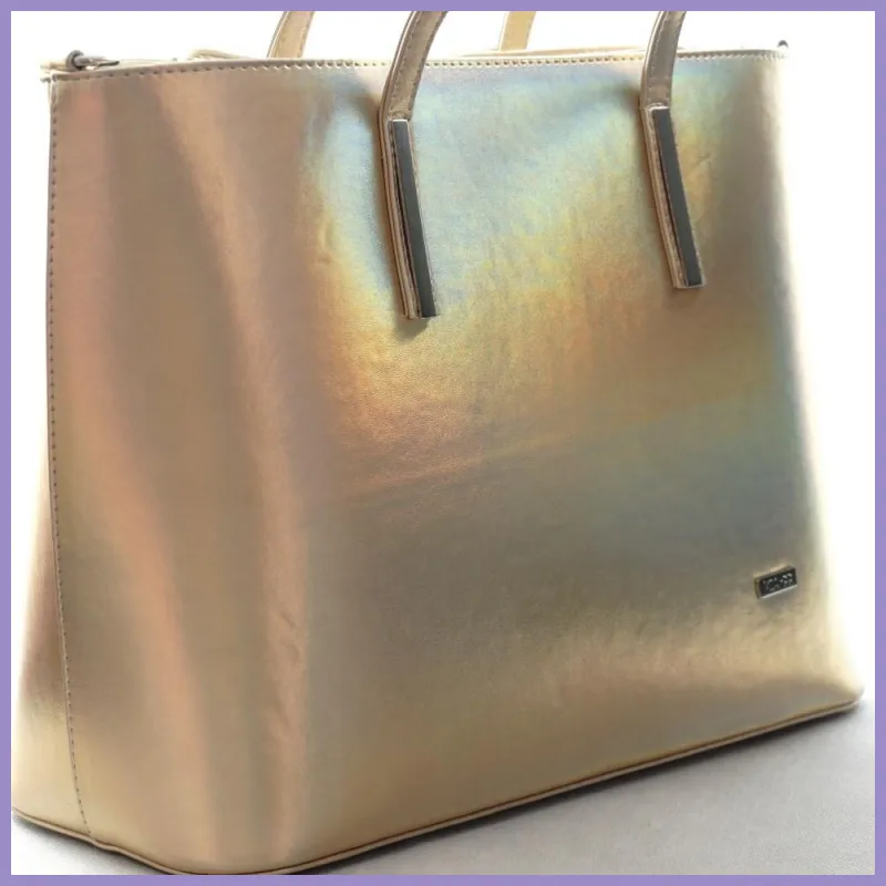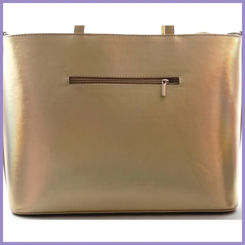 VIA55 elegáns nagyméretű kézitáska merev fazonban, rostbőr, arany színben. Hátulján cipzáras zsebe van, tetején szintén cipzárral nyílik. Belül osztott, 2 benyúlós és 2 cipzáras zseb. Méretei: 38×27×16 cm.