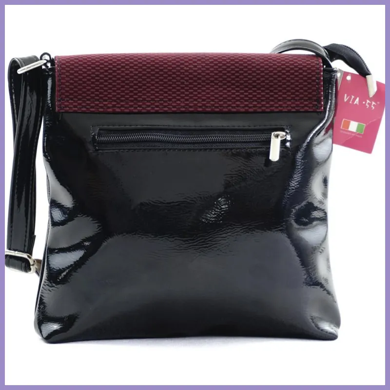 VIA55 elegáns női keresztpántos áthajtós táska, rostbőr, bordó színben. Elöl az áthajtós része két patenttal záródik. Alatta egy cipzáras zseb és két benyúlós zseb lapol. Hátulján cipzáras zseb. Belül egyterű, egy cipzáras és két benyúlós zseb. Méretei: 24×23×6 cm.