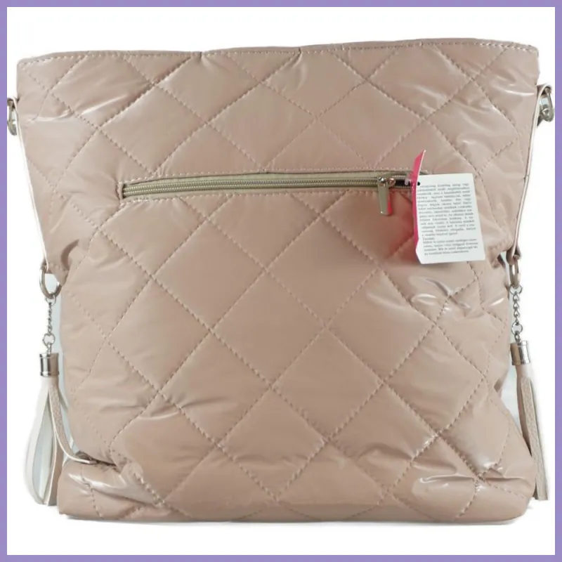VIA55 nagyméretű válltáska, oldalán lógós díszekkel. Belül osztott, 2 benyúlós és egy cipzáras zsebe van. Hátulján cipzáras zseb, tartozéka hosszú vállpánt. Méretei: 32x34x10 cm.
