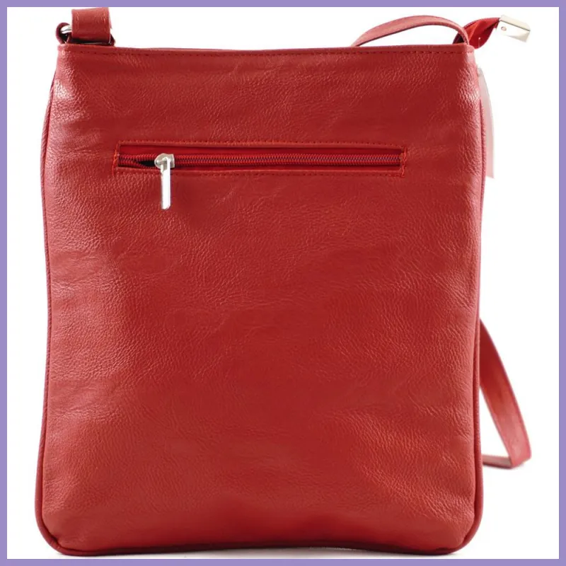 VIA55 női keresztpántos kistáska elöl széles zsebbel, rostbőr, vörös színben. Hátul is cipzáras zsebe van. Tetején cipzárral záródik, belül 2 benyúlós és 1 cipzáras zseb. Méretei: 24×27×4 cm.