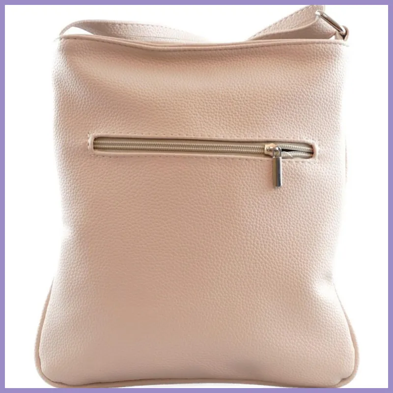 VIA55 női keresztpántos táska 3 sávval, rostbőr, bézs-ezüst színben. Hátulján cipzáras zsebe van. Tetején cipzárral záródik, belül 1 benyúlós zseb. Méretei: 24×27×4 cm.