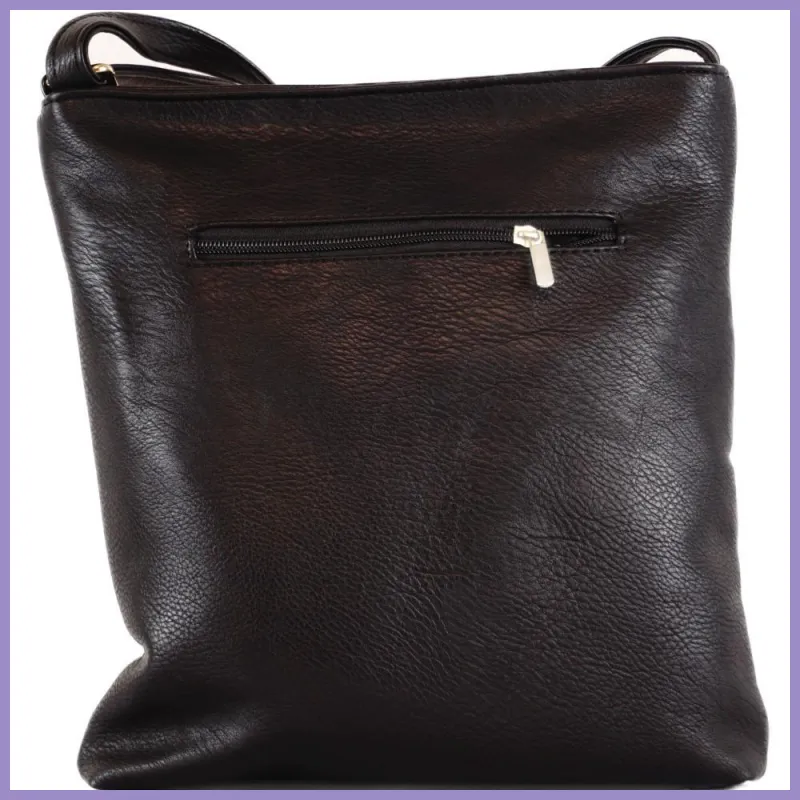 VIA55 női keresztpántos táska ferde zsebbel rostbőrből. Hátulján cipzáras zsebe van. Tetején cipzárral záródik, belül 2 benyúlós és 1 cipzáras zseb. Méretei: 27×30×4 cm.