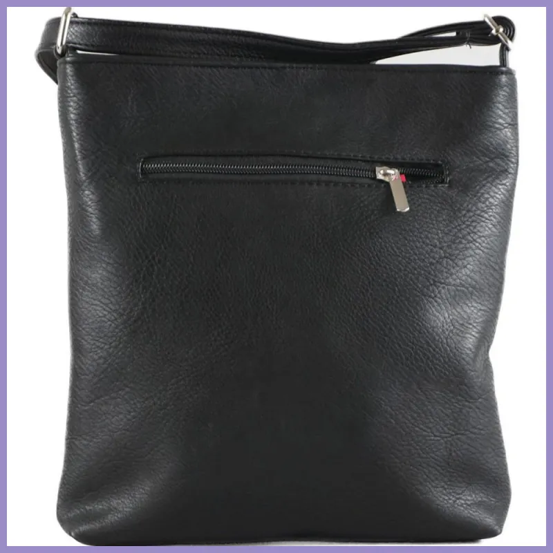 VIA55 keresztpántos táska rostbőrből. Belül egyterű, egy cipzáras és két benyúlós zsebbel. Kívülről elöl és hátul is cipzáras zsebe van. Méretei: 30×27×10 cm.
