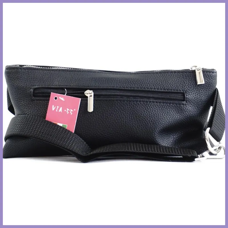 VIA55 női keresztpántos táska széles fazonban, rostbőr, sárga színben. Elején és hátulján széles cipzáras zseb. Tetején cipzárral záródik, belül 1 cipzáras zseb. Méretei: 29×13×4 cm.